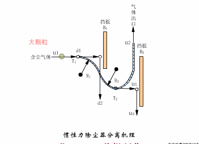 慣性除塵設(shè)備分為碰撞式和回轉(zhuǎn)式兩種。前者是沿氣流方向裝設(shè)一道或多道擋板,含塵氣體碰撞到擋板上使塵粒從氣體中分離出來。顯然,氣體在撞到擋板之前速度越高,碰撞后越低,則攜帶的粉塵越少,除塵效率越高。后者是使含塵氣體多次改變方向,在轉(zhuǎn)向過程中把粉塵分離出來。氣體轉(zhuǎn)向的曲率半徑越小。轉(zhuǎn)向速度越多,則除塵效率越高。