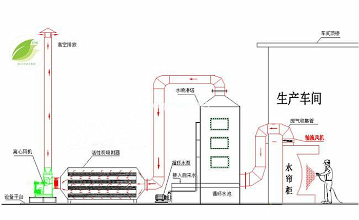 廢氣源→高效吸收塔(吸收掉漆霧、粉塵以及顆粒物)→活性炭吸附塔(吸附部分苯甲苯二甲苯)→→高壓風(fēng)機(jī)(高壓的吸力作用下持續(xù)將廢氣抽出車間)→煙囪高空排放(也可低空排放)。