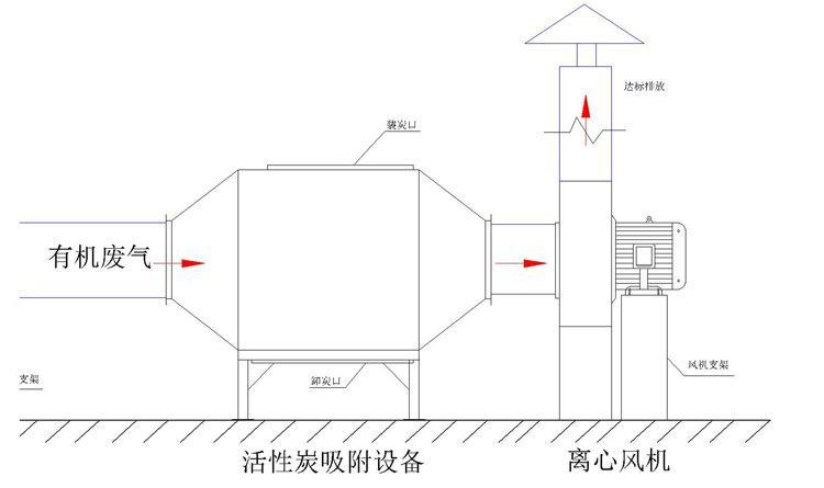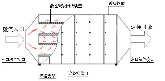 廢氣經(jīng)過吸附塔內(nèi)的初效過濾器除去固體顆粒物后,進入塔體,經(jīng)過活性炭層吸附后,除去氣體中的有機廢氣分子,達到符合排放標(biāo)準(zhǔn)的凈化氣體,經(jīng)風(fēng)機排到室外。