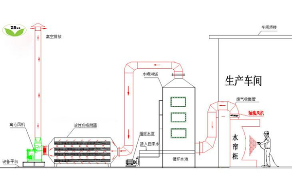 有機廢氣 → 風 機→ 風 管→ 旋流板塔→風機→ 活性炭吸附塔→ 達標排放